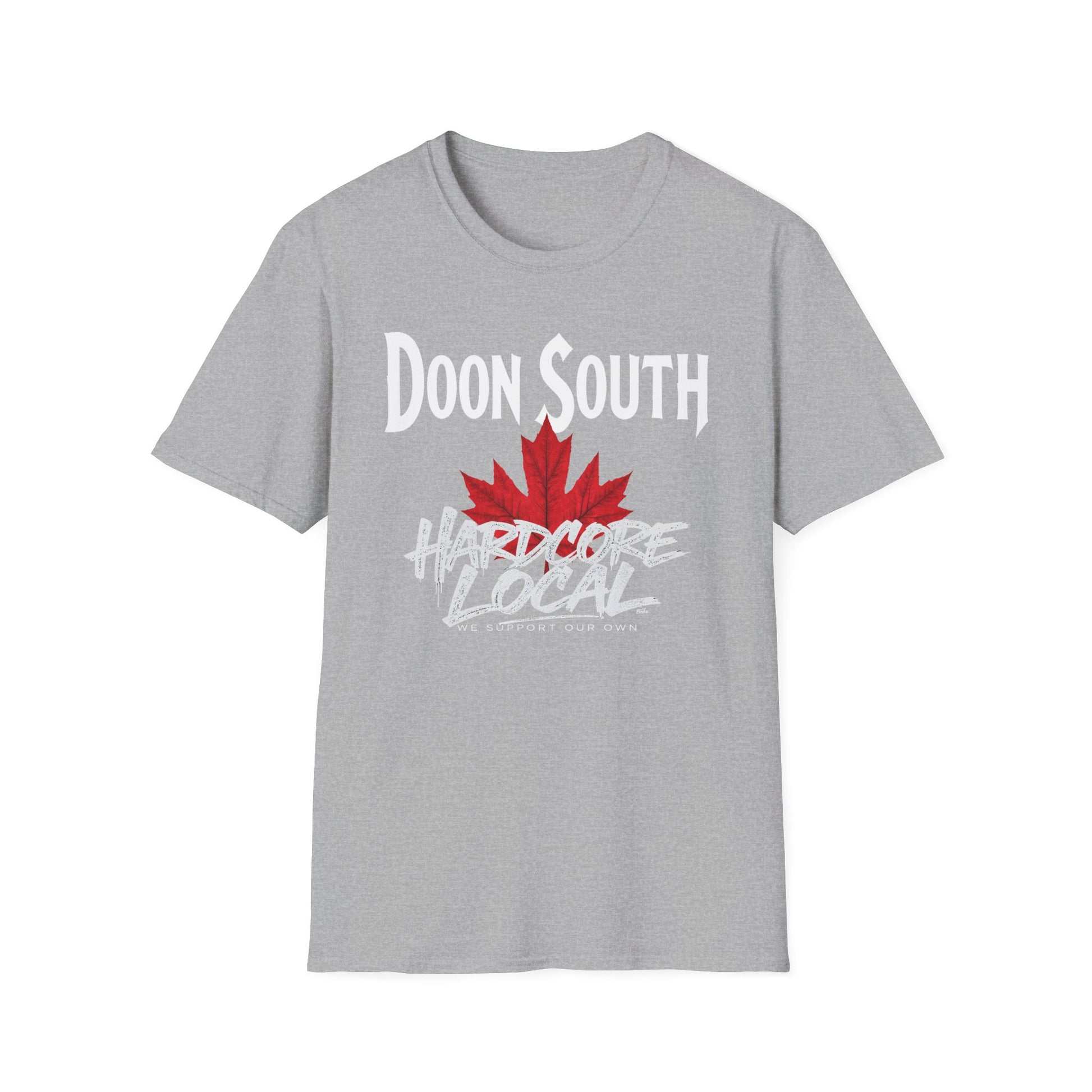 Doon South Hardcore We Support Our Own Red Leaf T-Shirt, c03-n02-s006 Softstyle Graphic Tee, Unisex Casual Wear, Support'n Locals Merch, Gift for Community Lovers.