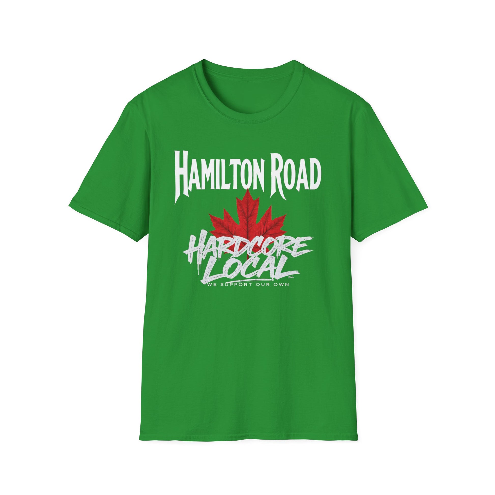 Hamilton Road Hardcore We Support Our Own Red Leaf T-Shirt, c02-n04-s006 Softstyle Graphic Tee, Unisex Casual Wear, Support'n Locals Merch, Gift for Community Lovers.