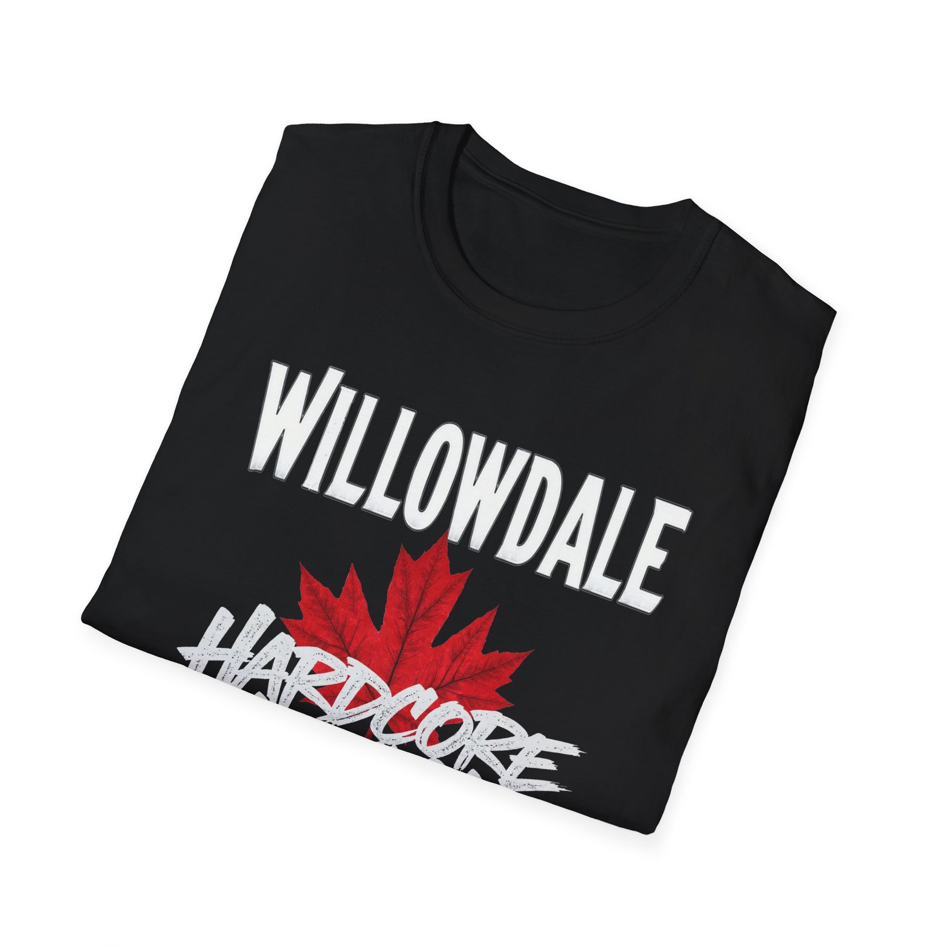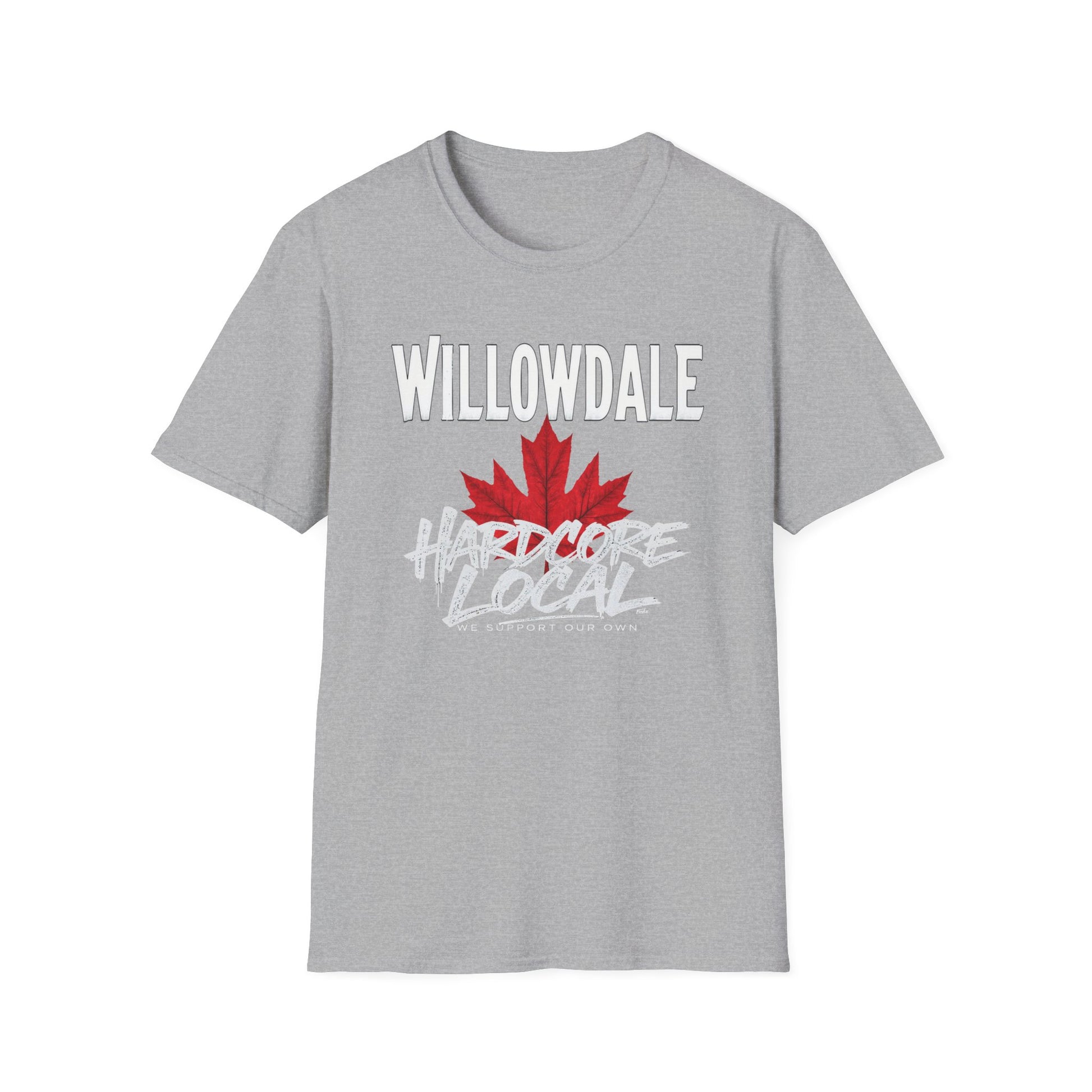 Willowdale Hardcore We Support Our Own Red Leaf T-Shirt, c06-n05-s006 Softstyle Graphic Tee, Unisex Casual Wear, Support'n Locals Merch, Gift for Community Lovers.